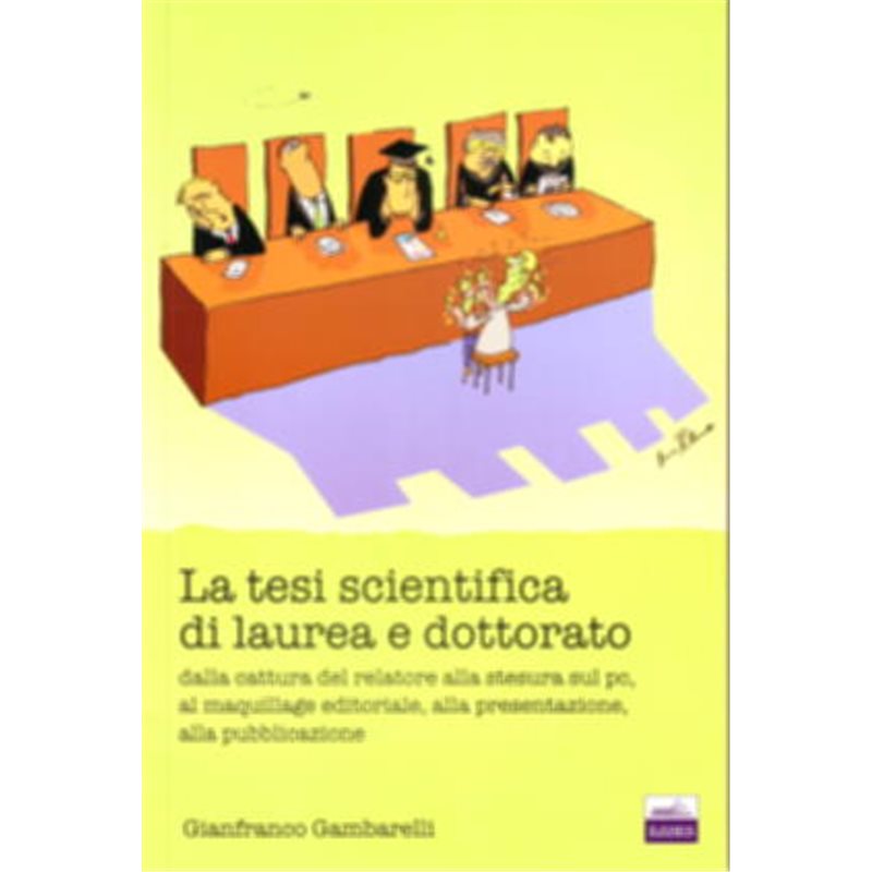 Una guida agile e di facile consultazione ricca di consigli sulla stesura della tesi di laurea in tutte le sue fasi: dalla scelta del relatore alla ricerca bibliografica, dalla stesura al maquillage editoriale, dalla esposizione alla pubblicazione. 1. La tesi, il relatore, il personal; 1.1 La tesi: che cos’è ; 1.2 Come, dove, quando, perché; 1.3 La cattura del relatore 1.4 I rapporti con il relatore; 1.5 I rapporti con il “personal; 2. La forma 2.1 Gli standard 2.2 Il maquillage editoriale 2.3 La lingua 2.4 La lingua che muore 3. La sostanza 3.1 La ricerca 3.2 La stesura 3.3 Le operazioni finali 4. Alcune particolari discipline 4.1 Introduzione 4.2 Algoritmica, Informatica e Automazione 4.3 Arte 4.4 Astronomia 4.5 Botanica e Zoologia 4.6 Chimica e Biologia 4.7 Commercio 4.8 Fisica 4.9 Geografia 4.10 Geologia e Archeologia 4.11 Giurisprudenza 4.12 Matematica, Statistica e Ingegneria 4.13 Medicina e Farmacologia 5. La discussione 5.1 Come si svolge 5.2 Come prepararsi 5.3 Ora X: come procedere 6. L’eventuale pubblicazione 6.1 Introduzione 6.2 La nuova versione 6.3 La versione in inglese 6.4 Oltre le istruzioni per autori 6.5 La spedizione 6.6 I rapporti con l’editore