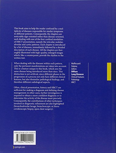 This book aims to help the reader confused by a multiplicity of diseases responsible for similar symptoms in different patients. Consequently, the chapters are noticeably sign-oriented rather than disease-oriented, each dealing with one of the four cardinal modalities of HRCT presentation, namely the reticular, nodular, alveolar and cystic patterns. Each chapter is introduced by a list of diseases, immediately followed by a detailed description of each disease. All the chapters are thoroughly illustrated with high-quality, enlarged images which, like a counterpoint, provide the rhythm to the written text. When dealing with the diseases within each pattern, only the pertinent manifestations are taken into account. This is a feature unique to this book, which sees the same disease being introduced more than once. This distinction is not artificial, since different phases in the progression of a process not only have different clinical features, but also dissimilar pathological findings, and therefore different radiological aspects. Often, clinical presentation, history and HRCT are sufficient for making a diagnosis and defining disease management; in other cases, further investigation is required to obtain a more confident diagnosis or to determine the activity of the disease more precisely. Consequently, the contributions of other techniques involved in diagnostic refinement are also highlighted (bronchoalveolar lavage, bronchoscopic or thoracovideoscopic biopsy, open chest surgery).